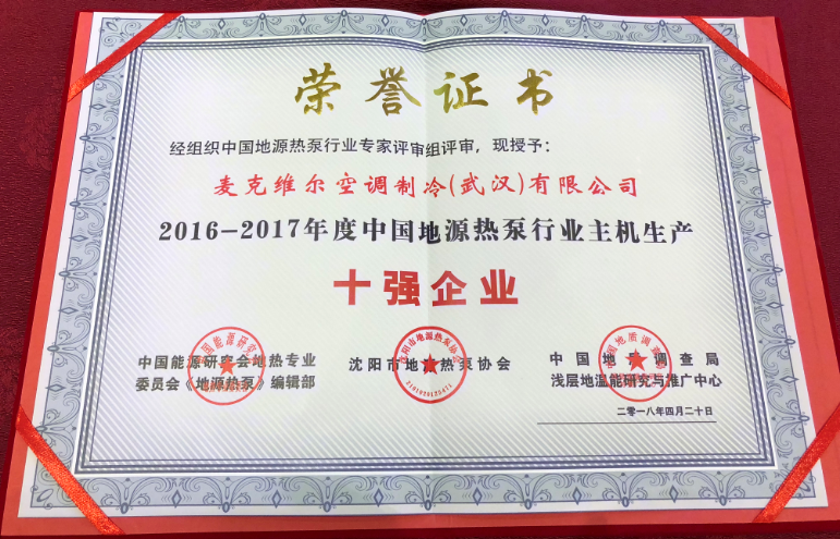 經會議專家的嚴格評審和一致認可,麥克維爾獲《2016-2017年度中國地源熱泵行業主機生產十強企業》榮譽,再一次證明了麥克維爾在地源熱泵行業的出色實力和深厚地位。