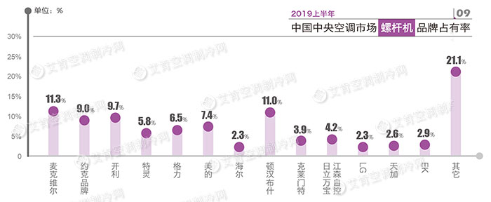 螺桿機產品的從業企業數量最多,是中國中央空調行業中競爭最為激烈的領域。克萊門特、EK、LG、江森自控日立萬寶等品牌不斷加大對于螺桿機產品的銷售力度,與經銷商通力合作,取得了不錯的銷售表現。近幾年,國產品牌不斷發力螺桿機市場,天加、盾安、國祥等品牌不斷拓展渠道,給外資品牌造成了極大的壓力。特別是在整體環境并不如意的2019上半年,面對工程項目時各大品牌不遺余力,從方案、價格、服務等方面下手,都做了最大程度的努力,目的就是為了搶占更多的市場份額。