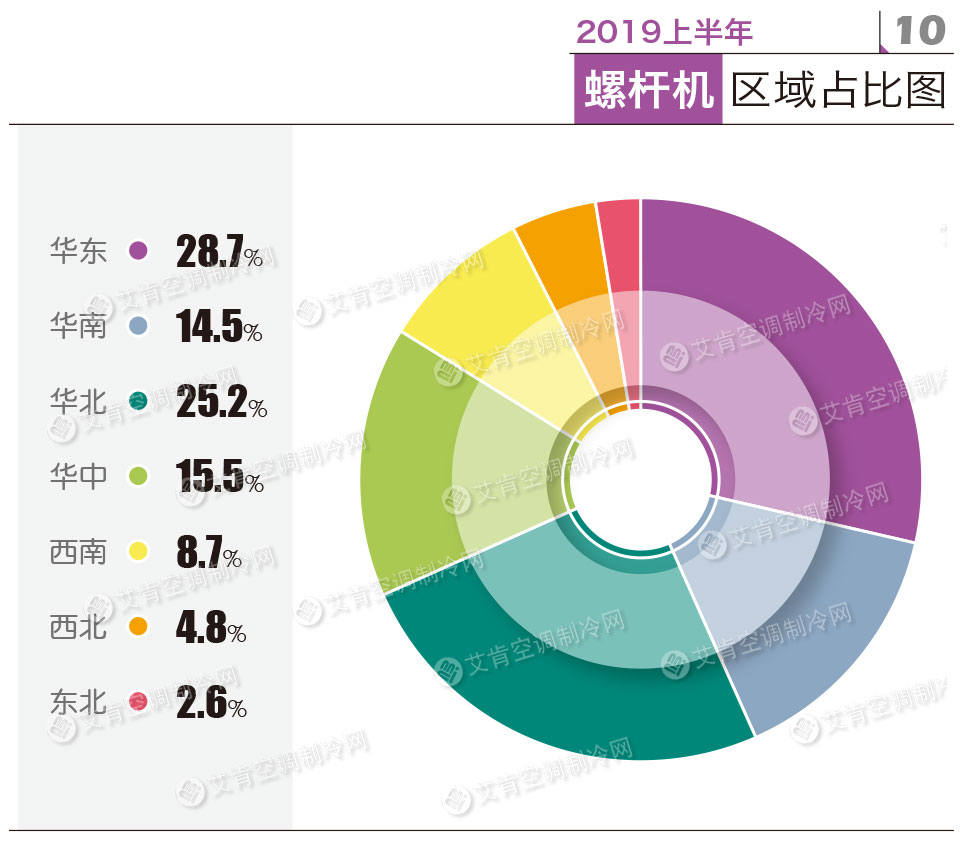 區域占比方面,華東地區依舊是螺桿機銷量最大的市場,28.7%的占有率排名第一,但是整體市場的項目數量和實際出貨數量卻有下滑的態勢。華北市場25.2%的占有率排名第二,其中山東、河北兩大城市是出貨的重點市場。華中和華南地區的占比接近,華中15.5%,華南14.5%。(見圖10)(江南)