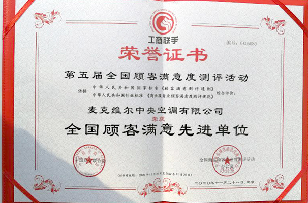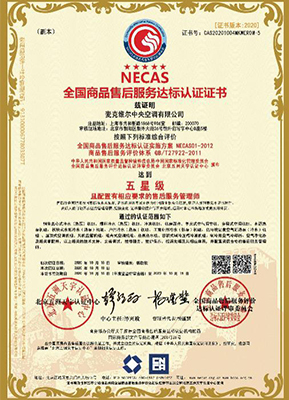 《商品售后服務評價體系》標準(GB/T27922-2011)是我國第一部關于商品售后服務好與壞評價的標準。該認證用于客觀反應企業售后服務工作的現實狀況,準確衡量企業售后服務的實際水平。以100分制評出服務星級, 95分以上即評定為最高級別“五星級”。“五星售后服務”體現了麥克維爾售后服務無論是在服務規章制度上還是在服務實力、服務水平上,都得到了專業認證機構的權威認證,這也是對麥克維爾服務人員的最大鼓勵和肯定。