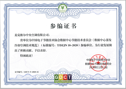 11月,麥克維爾正式作為《數據中心蒸發冷卻空調技術規范》(標準編號:T/DZJN 10-2020)的參編單位,榮獲中國電子節能技術協會、數據中心節能技術委員會頒發的表彰證書。