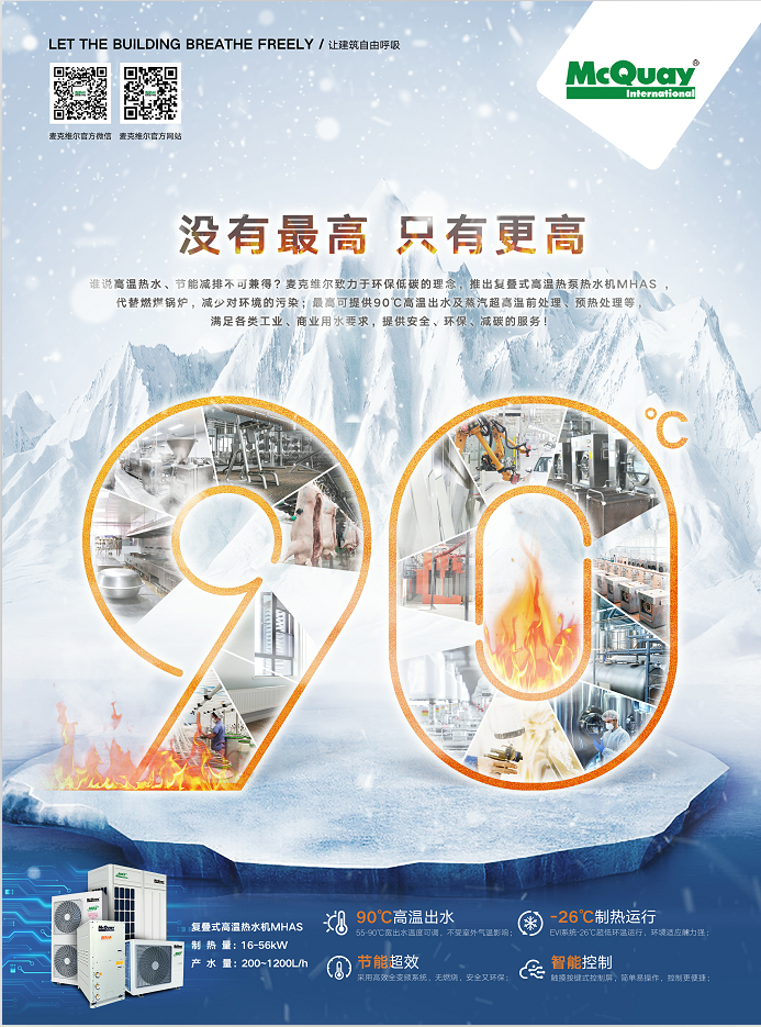 國家對環保問題越來越重視,碳中和相關政策要求減少碳排放,正在逐步取消和限制石化能源鍋爐的使用,以減少碳排放和其它污染物排放。麥克維爾推出采用可再生能源的90℃變頻空氣源高溫熱泵熱水機組,為電鍍、印染、屠宰、噴涂、采暖等行業提供環保節能的高溫熱水解決方案。機組采用復疊分體式設計,擁有眾多產品亮點。