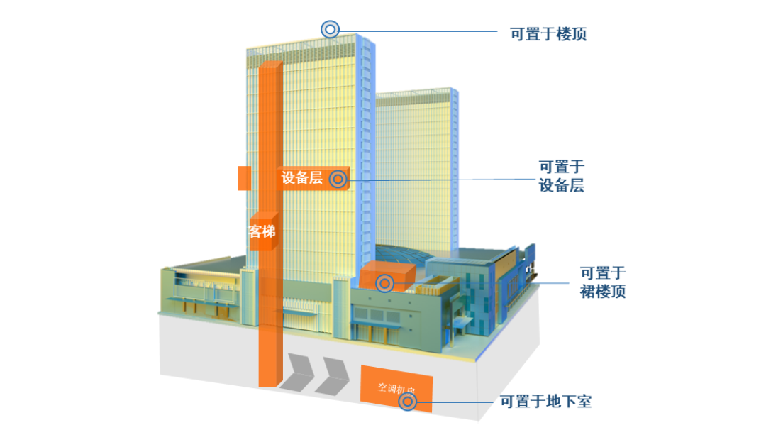 需求:部分項目機房空間小,通道狹窄,常規冷水機組無論運輸過程中的裝、卸工作還是工地吊裝就位,都需要使用大型的吊裝設備,安裝現場往往需要面臨破墻、拆裝機組、機房擴建等問題,造成較高的施工難度;部分項目建筑面積小,無單獨機房。