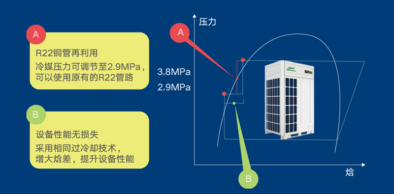 R22冷媒和R410A冷媒工作壓力不同,管路承壓不同,MDS R更新用多聯(lián)機(jī)具備冷媒配管自適應(yīng)壓力控制技術(shù),可隨時(shí)響應(yīng)系統(tǒng)不同位置壓力參數(shù)。