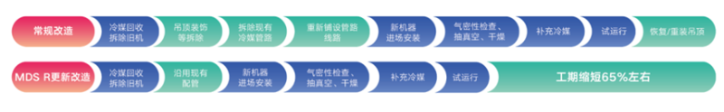 MDS R更新用多聯(lián)機(jī)可減小拆卸、重新安裝的繁冗工程量,可以沿用老舊工程配管、電氣配線及原有室內(nèi)機(jī)。大幅減少了工程量,老舊工程改造施工周期縮短約65%,避免因施工產(chǎn)生大量廢棄物,更加節(jié)約環(huán)保。