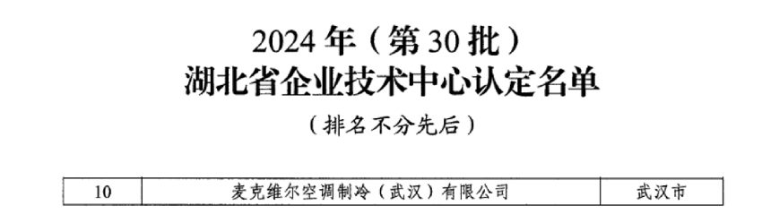 近日,湖北省發(fā)改委公布了2024年(第30批)新認(rèn)定湖北省企業(yè)技術(shù)中心名單,麥克維爾空調(diào)制冷(武漢)有限公司憑借在新產(chǎn)品創(chuàng)新、專業(yè)技術(shù)服務(wù)等領(lǐng)域的研發(fā)實(shí)力,一次性通過評(píng)審,成為省級(jí)企業(yè)技術(shù)中心。