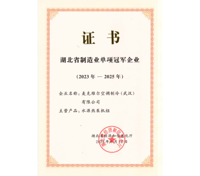 此次榮獲“2024年度湖北省制造業(yè)單項(xiàng)冠軍”稱號(hào),不僅是對(duì)麥克維爾水源熱泵等產(chǎn)品的技術(shù)、性能和品質(zhì)的認(rèn)可,更是對(duì)長期堅(jiān)持創(chuàng)新、專注服務(wù)市場的肯定。