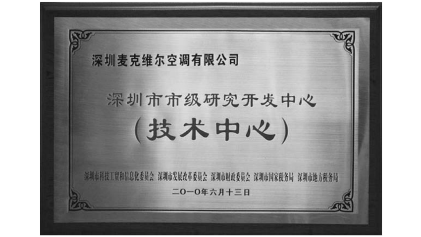 2010年,深圳麥克維爾空調(diào)有限公司獲深圳市市級(jí)研究開發(fā)中心(技術(shù)中心)認(rèn)定
