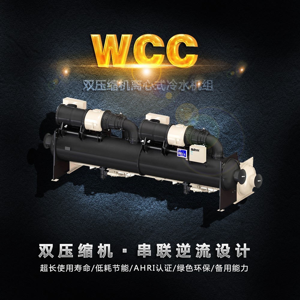 1.WCC是麥克維爾推出的雙壓縮機離心式冷水機組,雙壓縮機分時啟動,啟動電流低,兩臺壓縮機互為備用,有效的延長整機使用壽命。