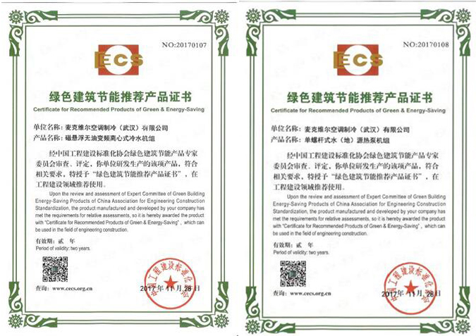 2017年11月28日,麥克維爾磁懸浮無油變頻離心式冷水機組、單螺桿式水(地)源熱泵機組憑借高效節能榮獲《綠色建筑節能推薦產品》證書,在工程領域被廣泛推薦使用。