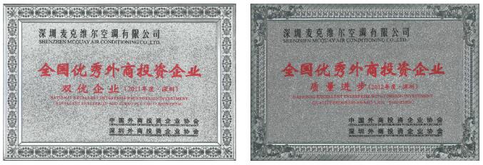 2012年12月19日,深圳2012年度深圳外商投資協(xié)會(huì)關(guān)于全國(guó)優(yōu)秀外商投資企業(yè)表彰大會(huì)在深圳五洲賓館隆重舉行。深圳麥克維爾空調(diào)有限公司獲得“全國(guó)優(yōu)秀外商投資企業(yè)-質(zhì)量進(jìn)步”獎(jiǎng),同時(shí)還獲得 “全國(guó)外商投資企業(yè)-雙優(yōu)企業(yè)”獎(jiǎng)。