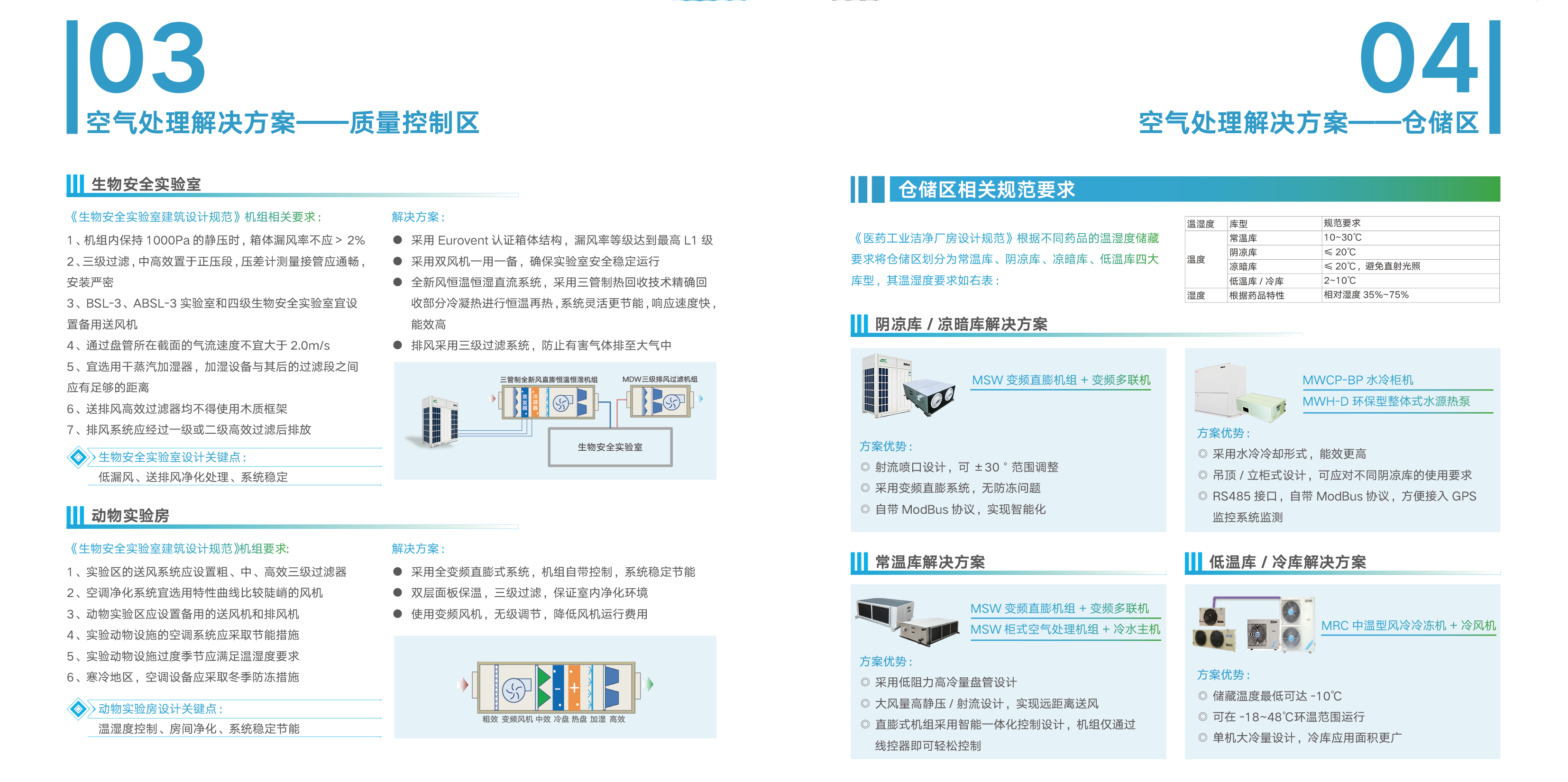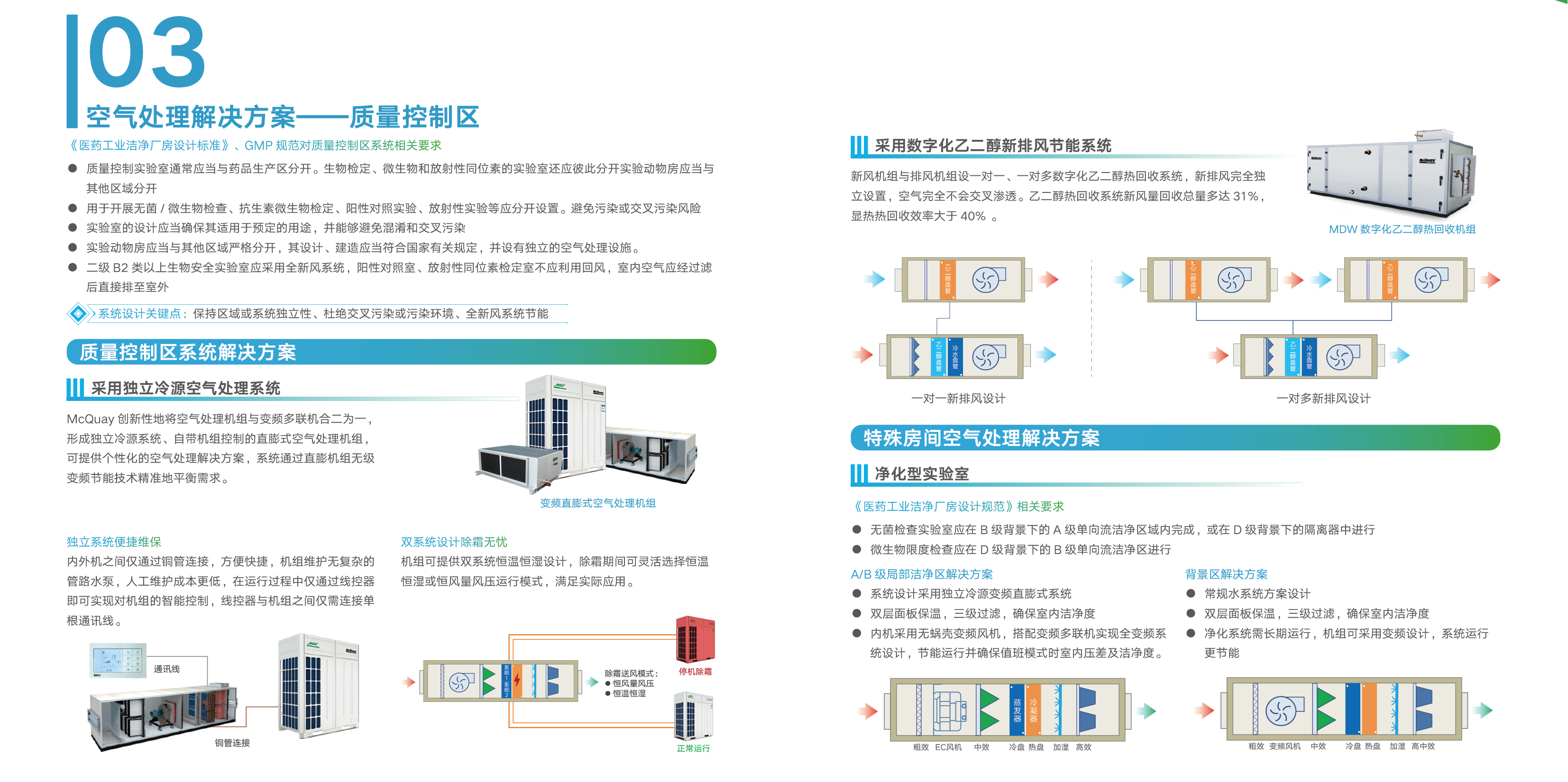 根據藥品生產質量管理規范GMP(2010版),制藥廠房可分為生產區、質量控制區、倉儲區、輔助區四大區域,麥克維爾憑借強大的研發力量,可為制藥廠房的四大分區提供全方位的高效低碳冷源方案和潔凈空氣處理產品解決方案,助力制藥行業長遠綠色發展。