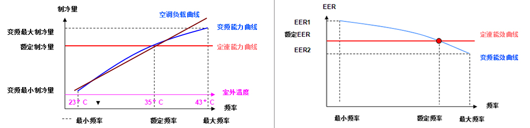 定頻空調(diào)的節(jié)能評(píng)價(jià)是按照額定能力、額定工況下的EER(空調(diào)器的制冷性能系數(shù))值來確定的,其指標(biāo)可以定性為實(shí)驗(yàn)室測(cè)試的相對(duì)評(píng)價(jià)指標(biāo),可以相對(duì)的評(píng)價(jià)出不同空調(diào)在額定能力下的節(jié)能好壞。但其不能真實(shí)反應(yīng)空調(diào)在消費(fèi)者實(shí)際使用運(yùn)行過程中的節(jié)能效果。定頻空調(diào)能效指標(biāo)只是考慮了額定工況下額定負(fù)載這一個(gè)點(diǎn)的節(jié)能特性。下圖為變頻空調(diào)與定頻空調(diào)制冷量與制冷效率范圍的對(duì)比圖。