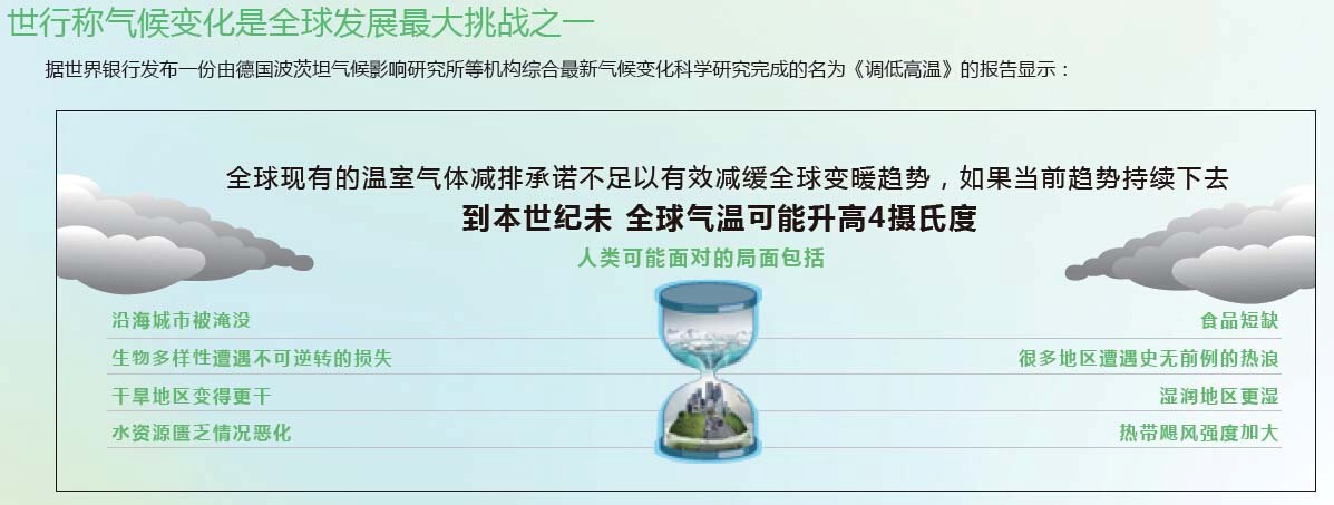 全球氣候變暖的趨勢不斷加劇,人類的生存和發展正面臨著嚴重的威脅和挑戰。世界衛生組織指出,如果對目前全球變暖的趨勢不加以阻止,以二氧化碳為主的溫室氣體造成的全球性氣候變暖將會帶來災難性的風險,如格陵蘭島和南極西部地區的冰蓋融化,將導致許多諸如馬爾代夫這樣的小島國被海水淹沒。而受氣候影響較明顯的疾病,如瘧疾、營養不良和腹瀉,目前估計已造成每年成百上千萬人的死亡。