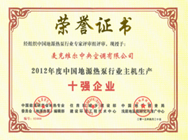 麥克維爾榮獲“2012年度中國地源熱泵行業主機生產十強企...