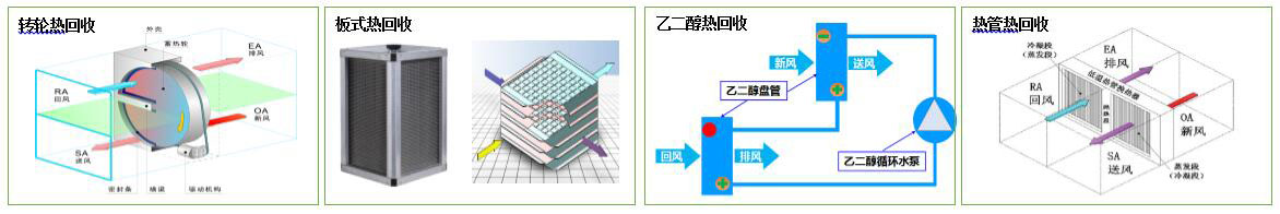 通常在新風機組和排風機組內(nèi)安裝一套熱回收裝置。一般夏季時,排風的溫(濕)度比新風要低,利用排風(冷風)對引入室內(nèi)的新風進行預冷,減少空調(diào)箱冷凍水的用量;冬季時,排風的溫(濕)度比新風要高,利用排風(熱風)對引入室內(nèi)的新風進行預熱,減少空調(diào)箱熱水或蒸汽的用量。這樣既可將排風中的熱量(冷量)傳遞給新風,從而實現(xiàn)熱能的回收。從排風中回收熱量的裝置有轉(zhuǎn)輪熱交換器、板式熱交換器、熱管式熱交換器、乙二醇熱交換器等。